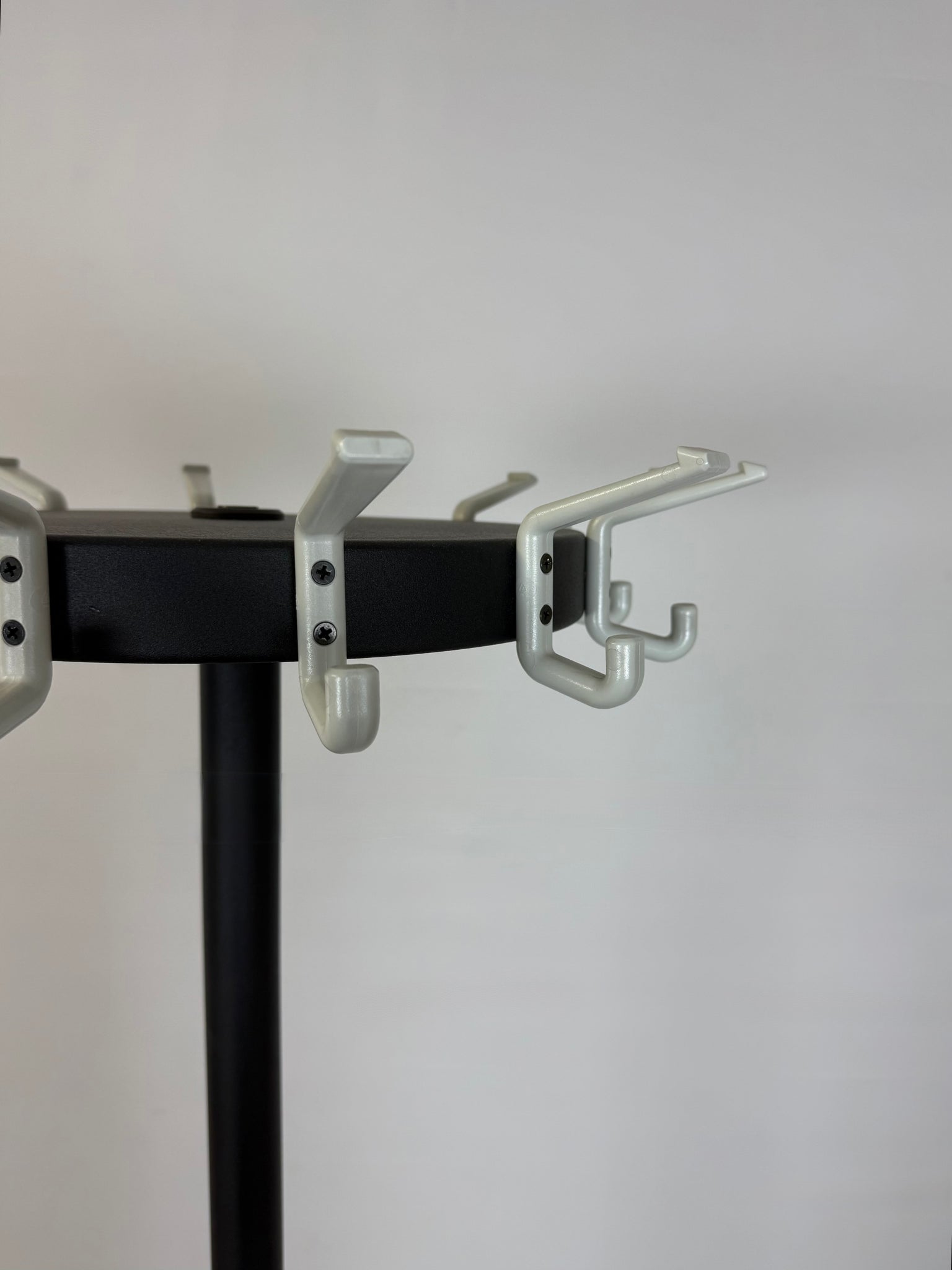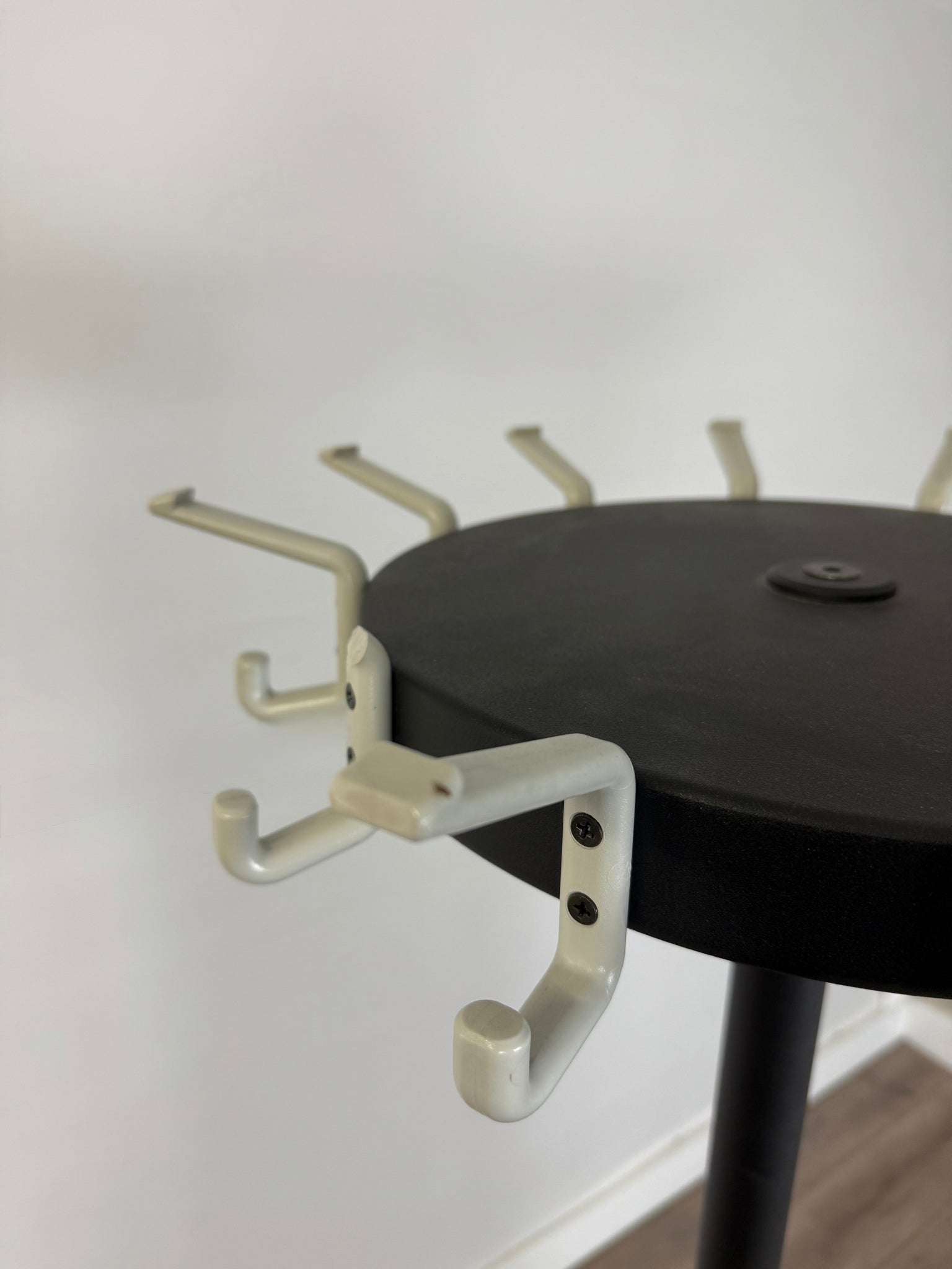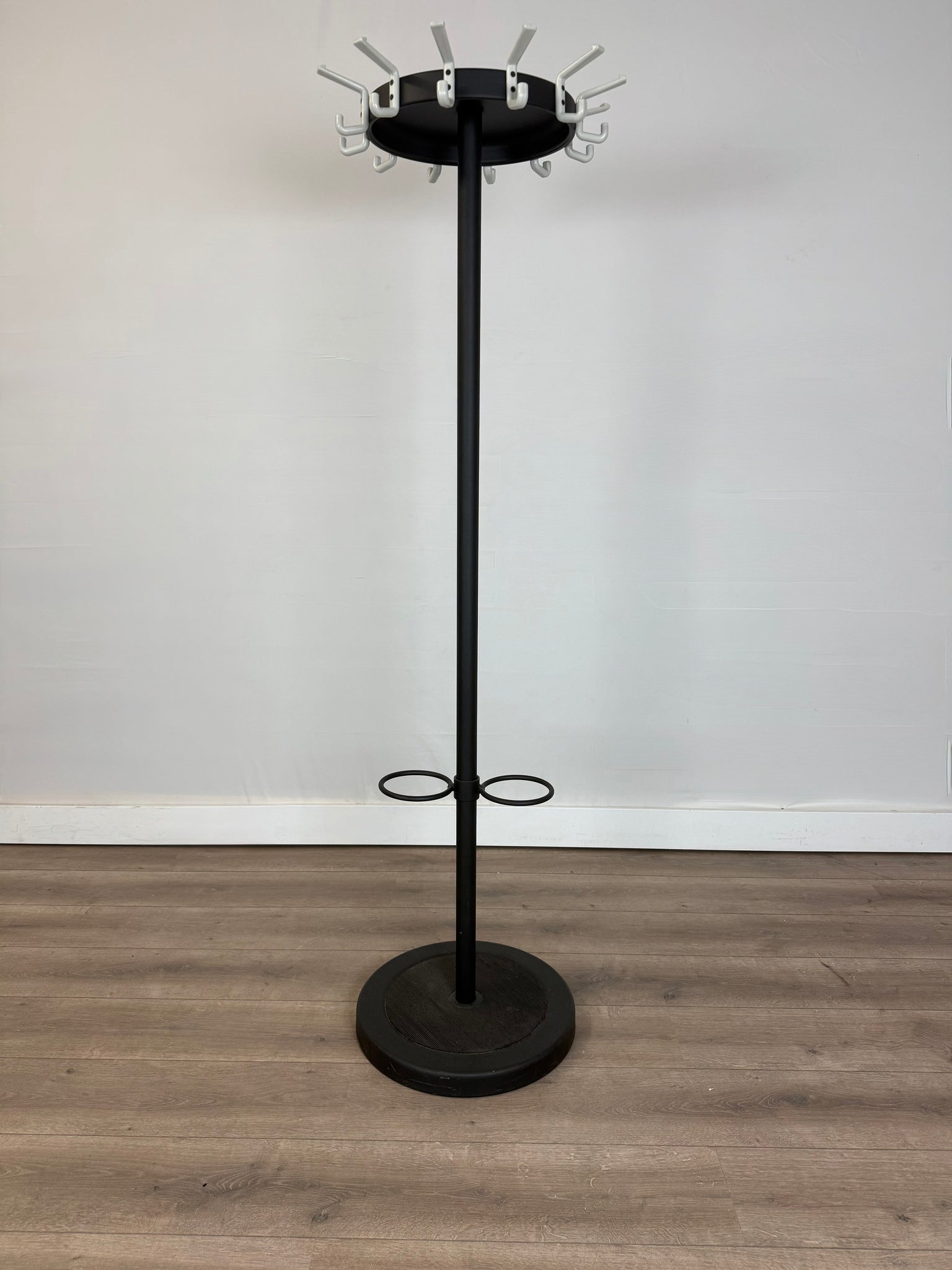De “Revolt” kapstok van Van Esch is een robuust maar elegant ontwerp dat bekend staat om zijn functionele eenvoud en industriële afwerking. De ronde verdeling met contrasterende witte haken biedt ruimte voor meerdere jassen, terwijl de zware voet optimale stabiliteit garandeert. Deze kapstok past perfect in moderne kantoor- of woonomgevingen waar een strak en tijdloos silhouet gewenst is.