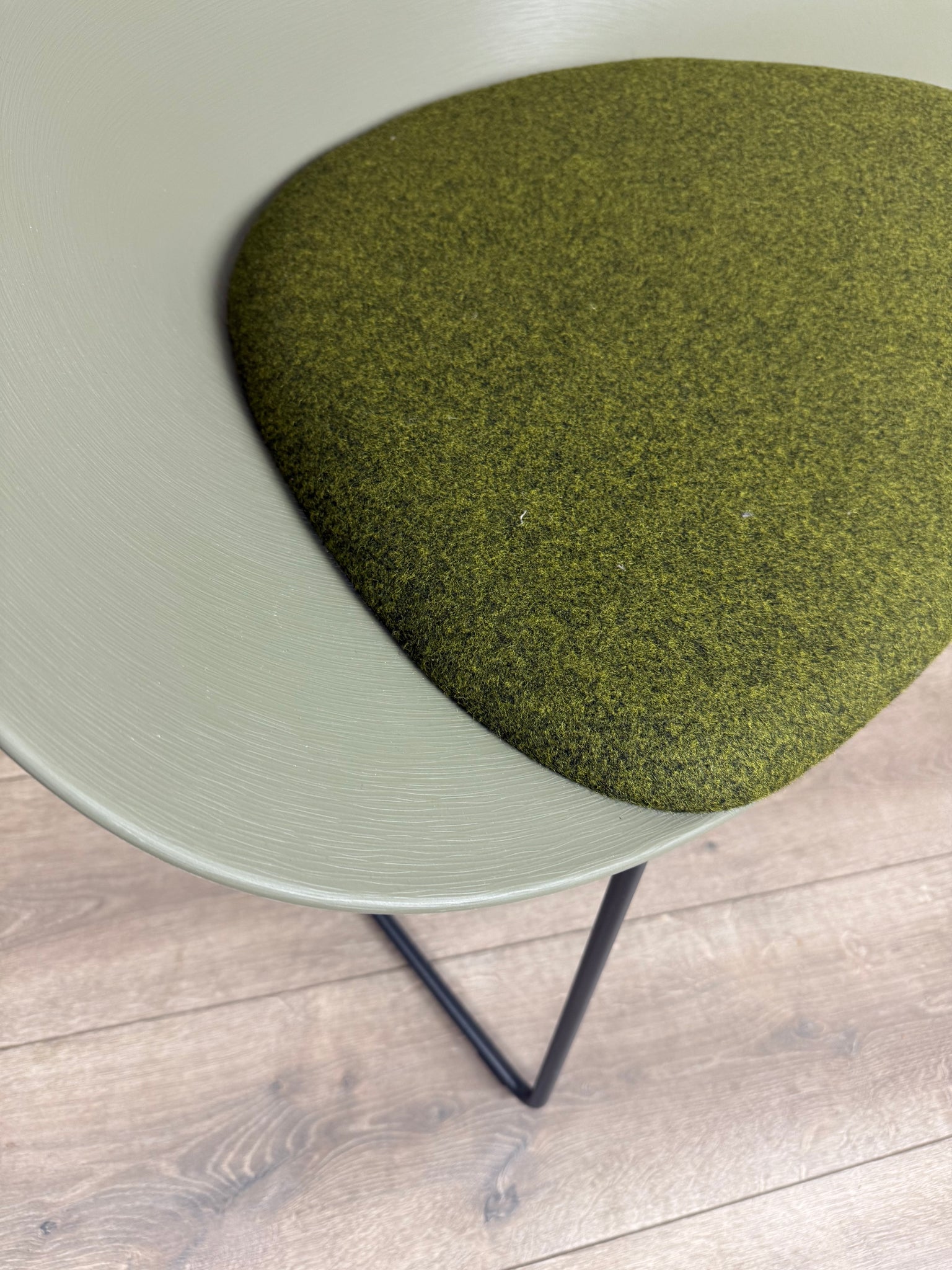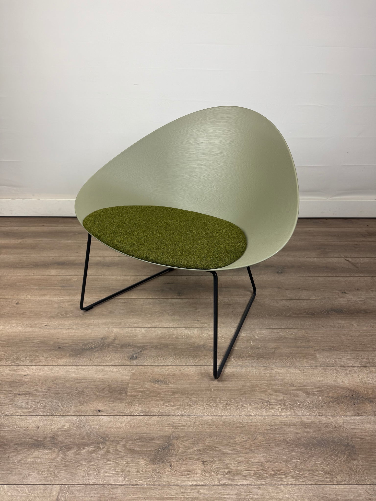 Het model combineert een lichte constructie met visuele zachtheid, waardoor het ideaal is voor zowel residentiële interieurs als publieke ruimtes zoals lobby’s, wachtruimtes of lounges. De variant met vilten kussen biedt extra comfort en een warm contrast met de matte schaal.