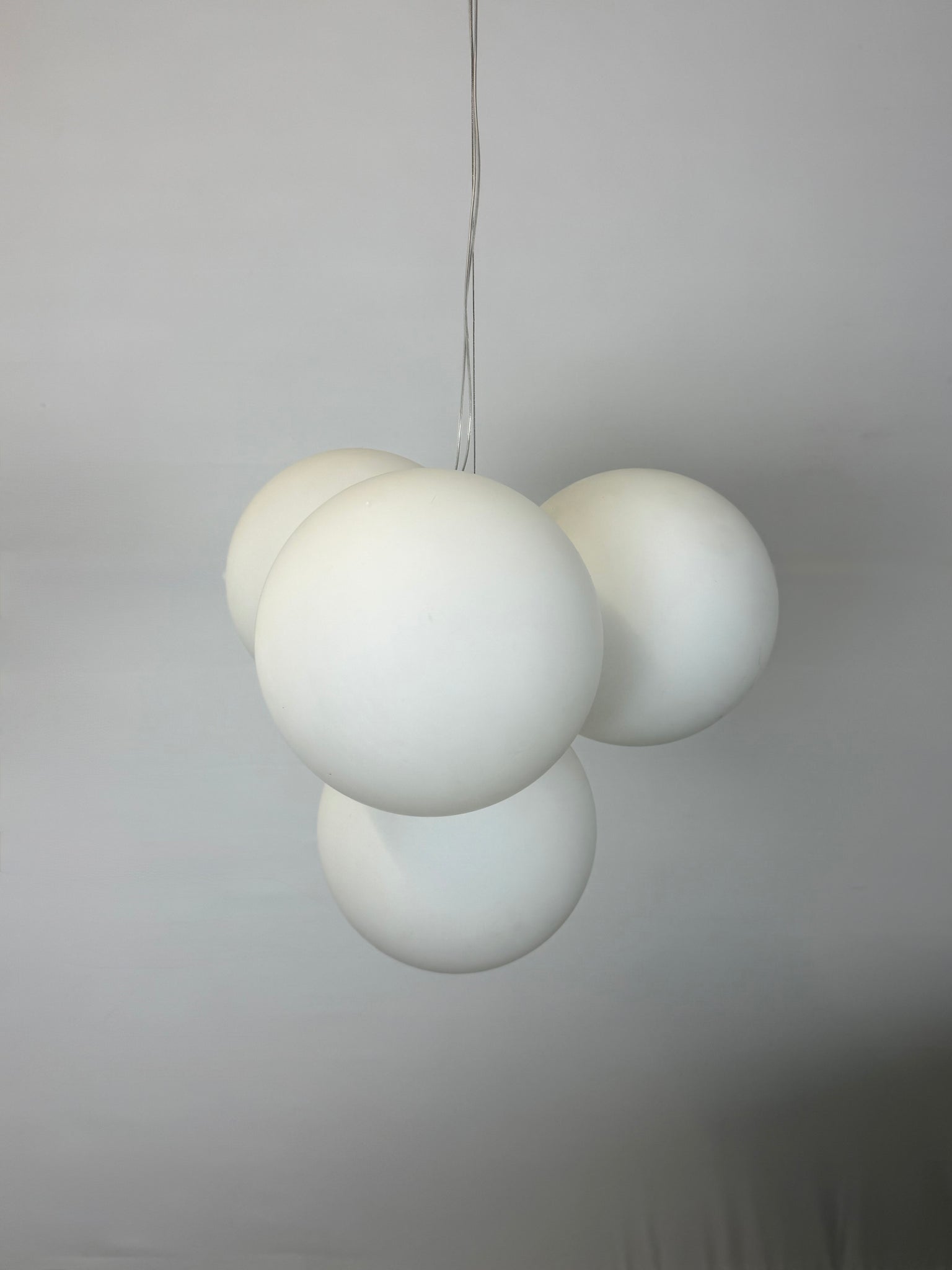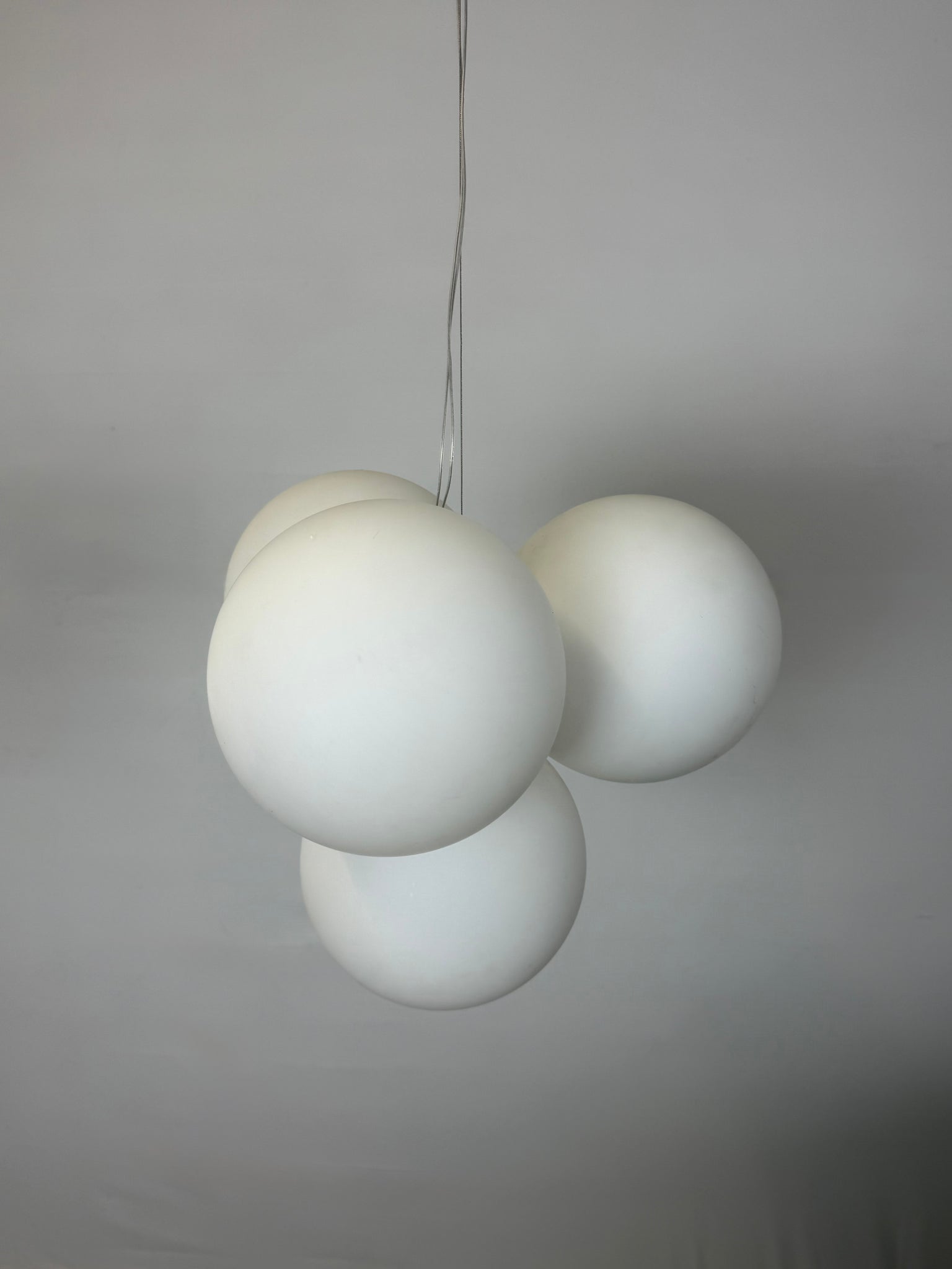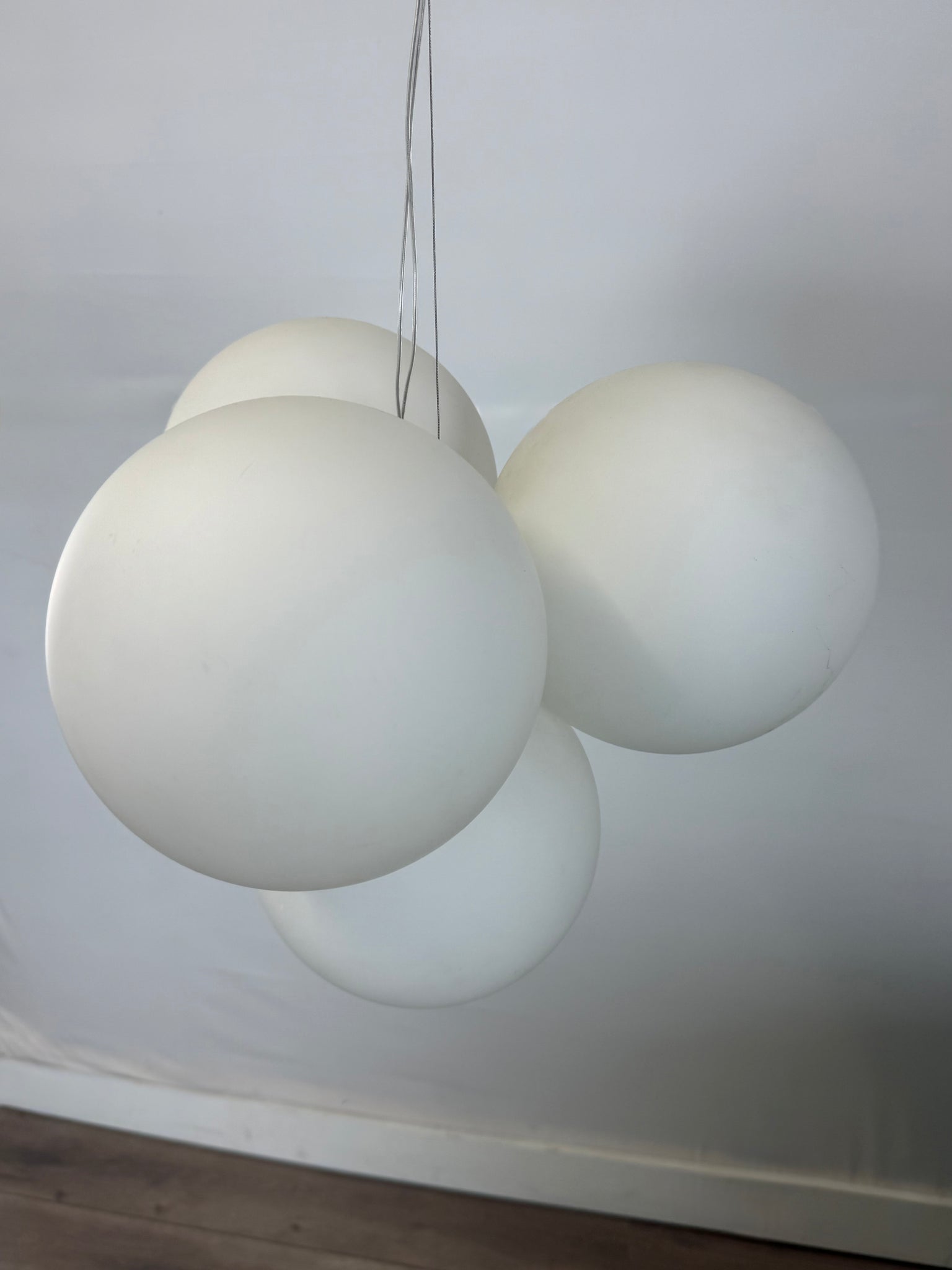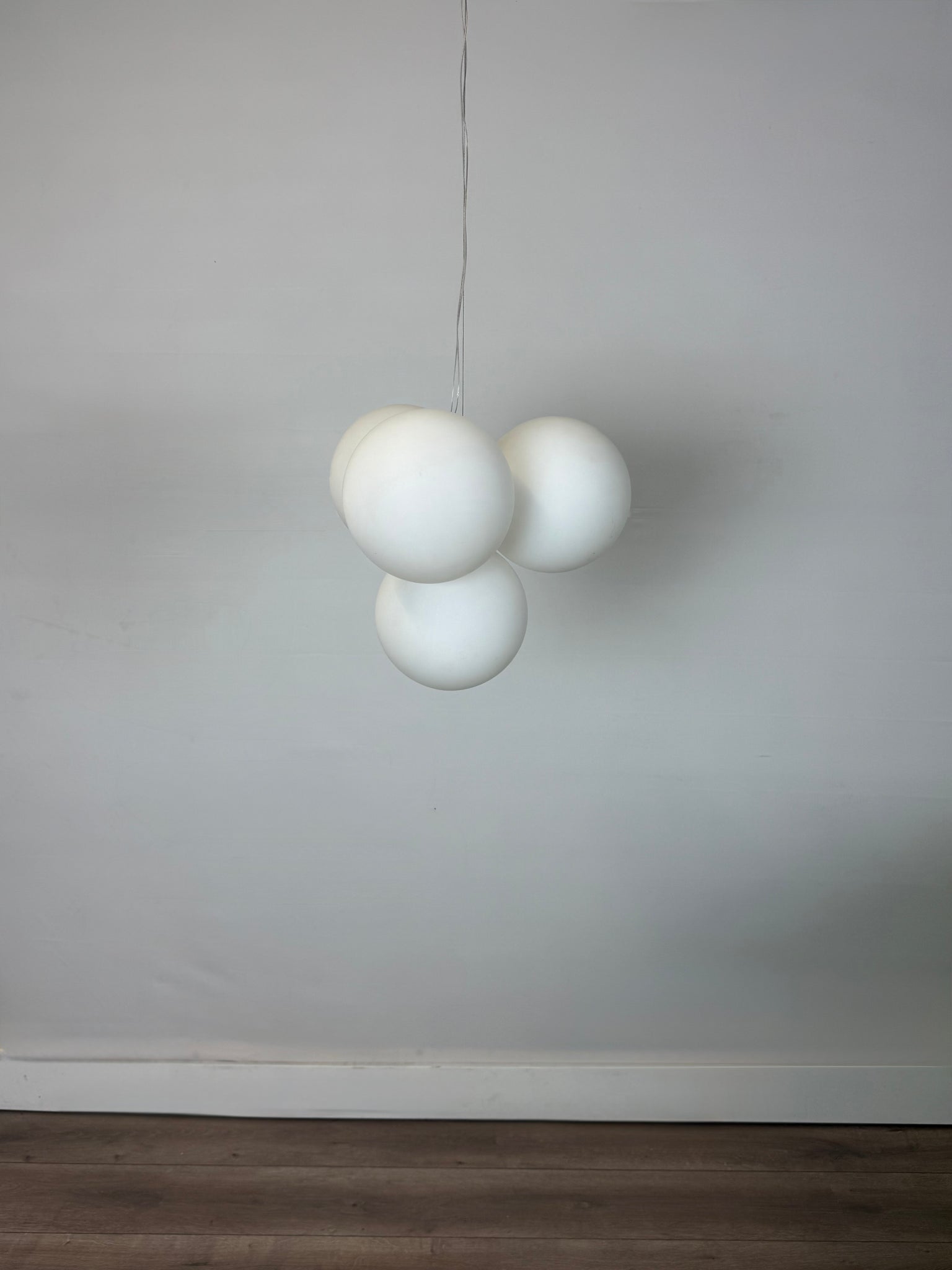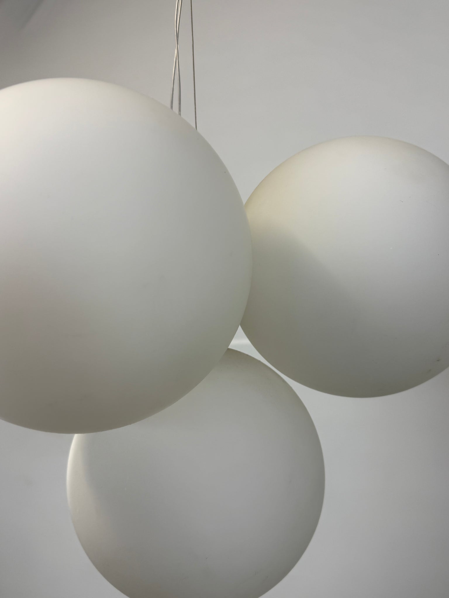 Afmetingen: diameter ca. 35 cm, hoogte ca. 32 cm Materiaal: Glas (bolvormige kappen) + metaal / chroom frame