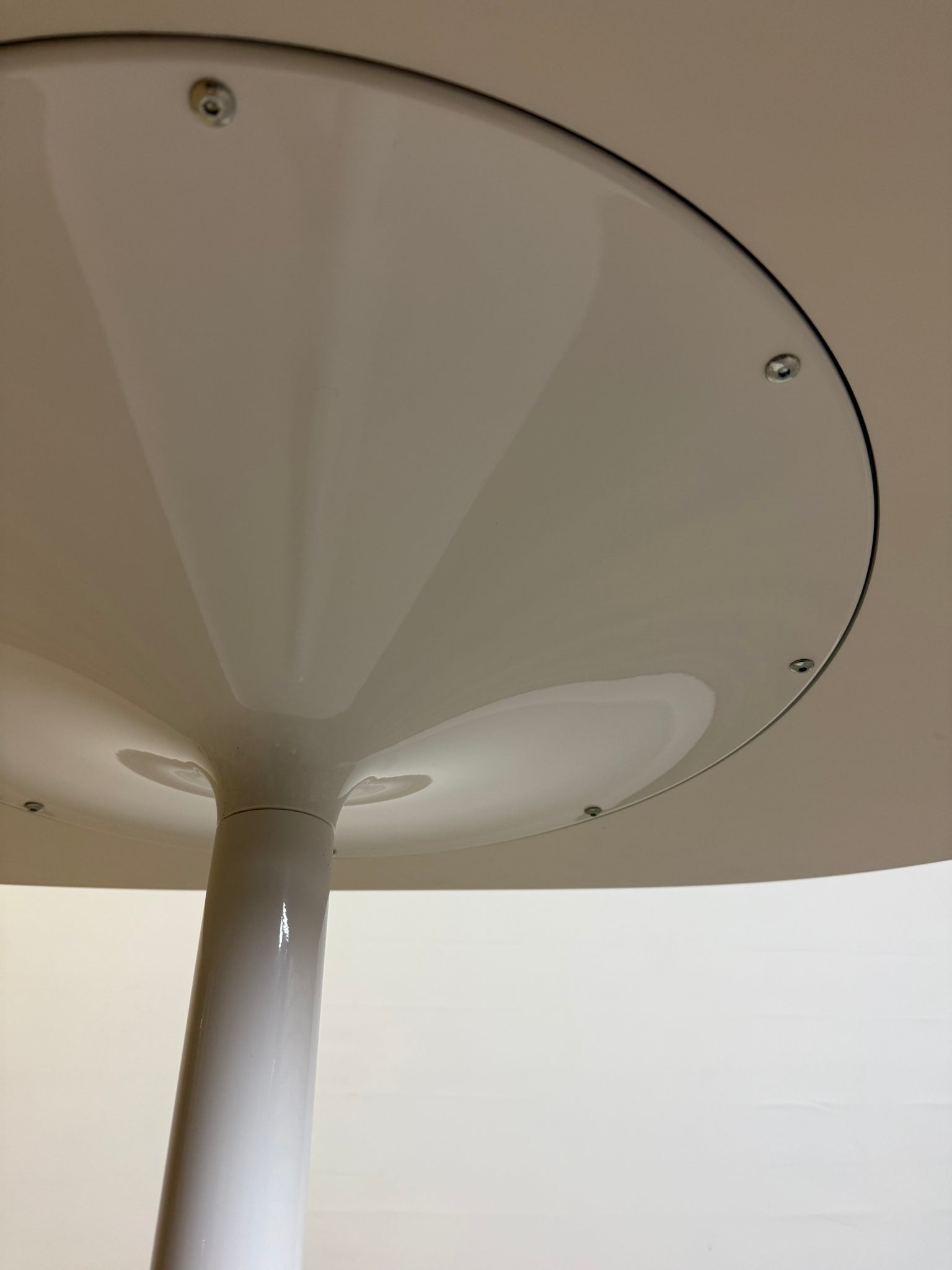 Materiaal: Gelakt MDF blad, stalen of aluminium centrale kolompoot met ovale voetplaat