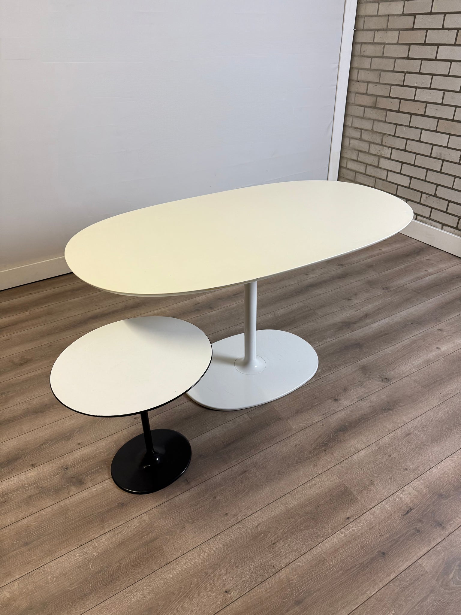 De Dizzie collectie van Arper is ontworpen door het Spaanse trio Lievore Altherr Molina en staat bekend om zijn zachte, organische vormen en verfijnde eenvoud. De ovale variant biedt een elegant alternatief voor traditionele ronde of rechthoekige tafels en past perfect in moderne interieurs — zowel als vergadertafel als eettafel. Dankzij de centrale kolomvoet biedt de tafel maximale beenruimte en een rustige, gebalanceerde uitstraling.